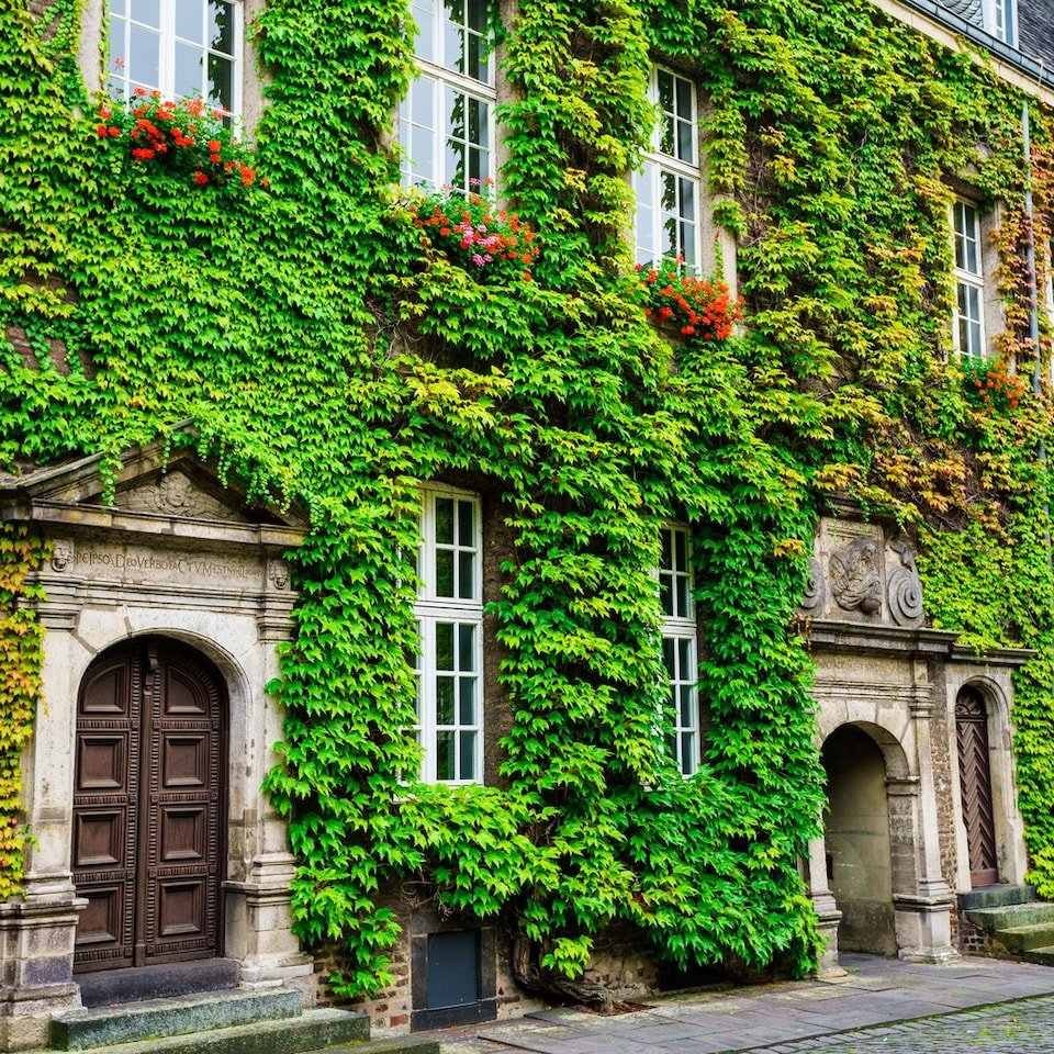 La hiedra, o Hedera helix, es una de las plantas más utilizadas para decorar fachadas. Es una planta perenne que destaca por sus hojas brillantes y de distintos tonos de verde. Con su crecimiento rápido y denso, cubre amplias superficies, creando una hermosa capa de vegetación. Esta trepadora prefiere ambientes de sombra parcial o total y es resistente en distintas condiciones climáticas. Durante el verano, necesita riego frecuente, alrededor de tres veces por semana; en el resto del año, con dos riegos semanales es suficiente. Una poda regular es clave para controlar su expansión y mantener su aspecto saludable.