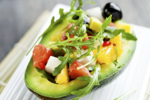 Otra opción de aguacates rellenos, pero esta vez con una ensalada fresca y vibrante. Se combinan trozos de aguacate con segmentos de naranja y pomelo, acompañados de mango en cubos, queso fresco y aceitunas negras. Se adereza con una vinagreta ligera de miel y limón, creando un contraste delicioso entre lo dulce y lo ácido.