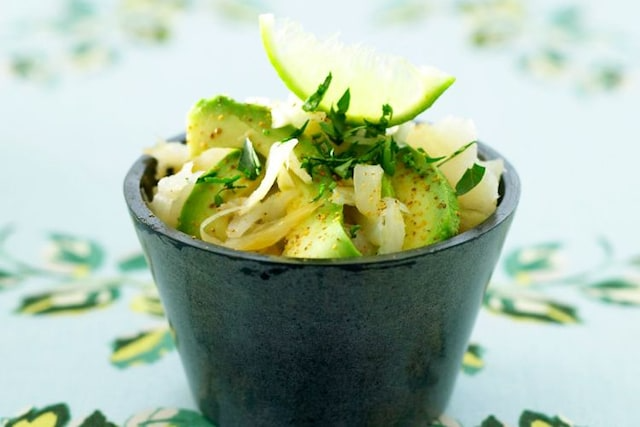 El aguacate es ideal para rellenar, ya que al retirar su semilla queda un hueco perfecto para agregar otros ingredientes. En este caso, se mezcla carne de aguacate con gambas cocidas, atún en conserva y verduras como cebolla morada y pimientos. Se adereza con una mayonesa ligera o yogur griego para darle una textura más cremosa. Se sirve directamente dentro de la cáscara del aguacate para una presentación atractiva.