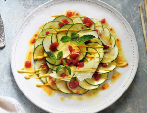 Carpaccio de calabacín con parmesano y vinagreta de frambuesa