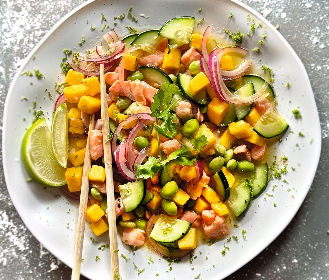El ceviche es una de las preparaciones más curiosas porque transforma el pescado sin usar fuego. El ácido de la lima altera las proteínas del salmón, dándole una textura firme y un sabor fresco. Además, al no usar calor, se conservan mejor las vitaminas y minerales. Esta técnica ancestral combina perfectamente con ingredientes dulces como el mango y el frescor vegetal del pepino, creando un plato colorido y lleno de energía.