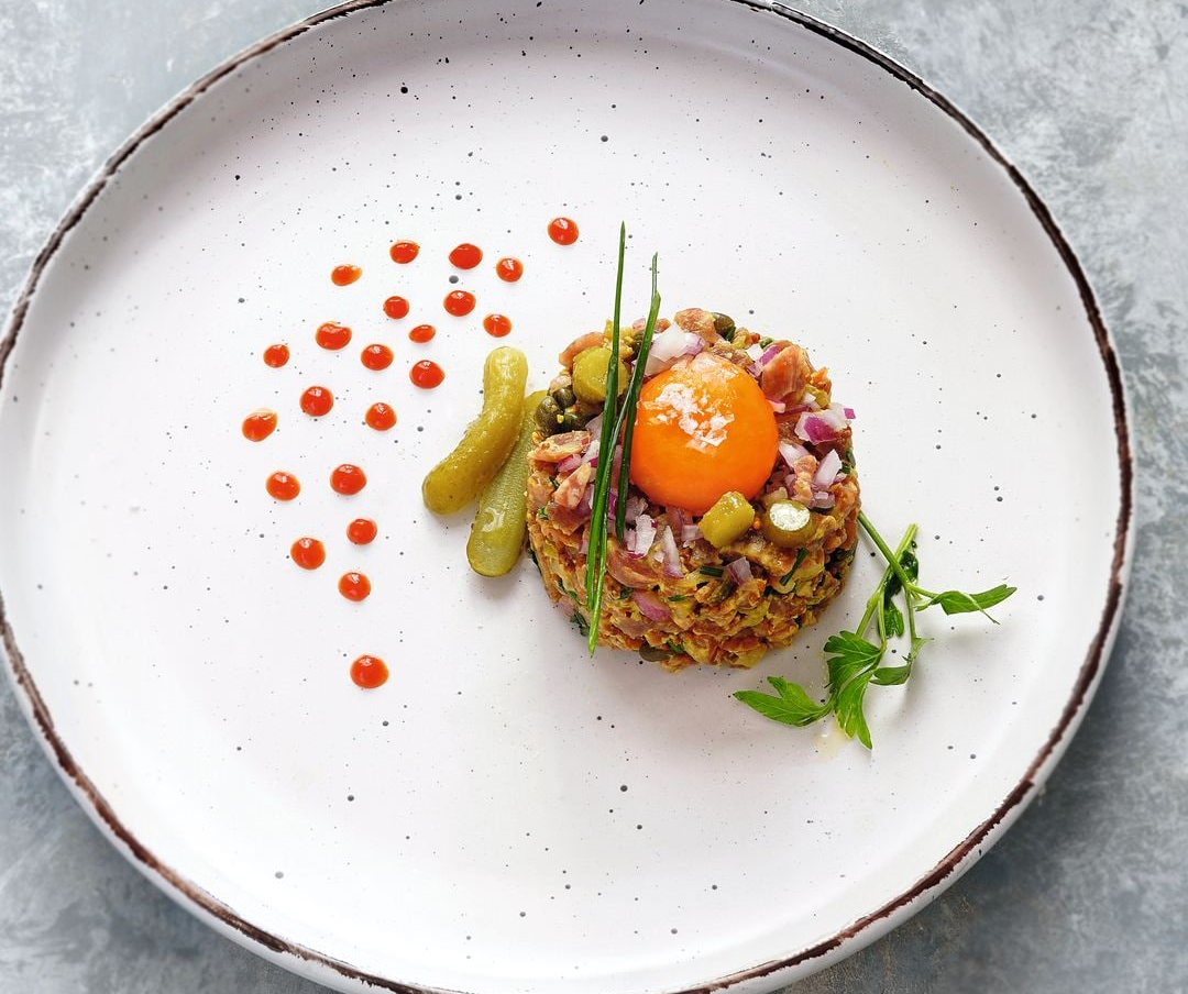 Este plato demuestra que no es necesario recurrir a cortes de carne caros para disfrutar de un tartar sabroso. El fuet, con su sabor intenso, ofrece una versión original que combina lo rústico y lo elegante. La yema curada, por su parte, suma cremosidad y un matiz salino que equilibra el conjunto.