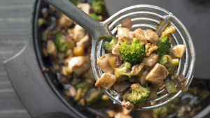 - Calienta el aceite en un wok a fuego medio y saltea el pollo hasta que empiece a dorarse.
