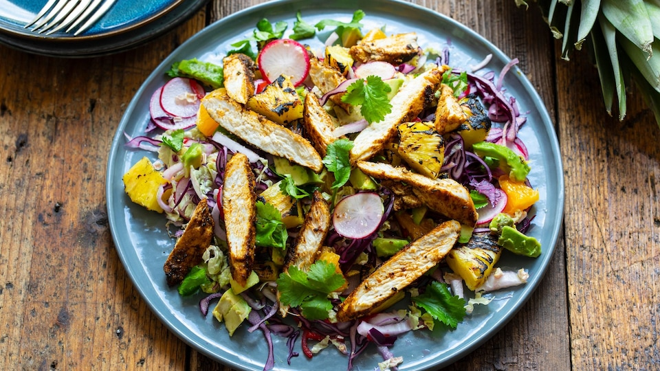 - Coloca en una ensaladera las hojas verdes, la col, la piña, el aguacate, el pollo y los rabanitos.