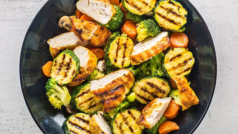 Pechuga de pollo braseada con calabacín, brócoli y zanahoria