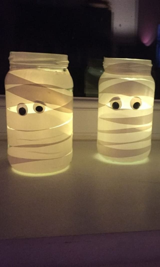Iluminar la noche de Halloween con faroles es una gran idea, y al darles un aspecto de momia, les añadimos un toque espeluznante perfecto para la ocasión. Puedes hacer estos faroles con frascos o tarros de vidrio y un poco de cinta adhesiva. Es importante utilizar velas eléctricas en lugar de las tradicionales, para que los niños puedan participar de manera segura.