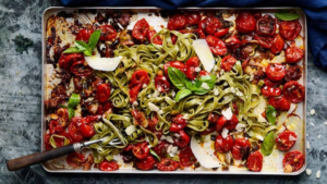 - En una bandeja de horno, coloca la pasta cocida, la mezcla de tomate y puerro, las avellanas picadas y las hierbas aromáticas. Rocía con aceite de oliva.