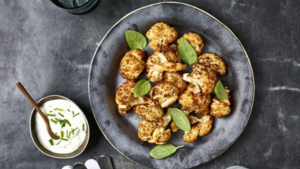 1. Bocaditos de coliflor especiada con salsa de cebollino