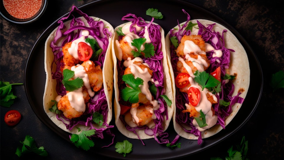 6. Calienta las tortillas y rellénalas con lombarda, cherry, coliflor, chile picado y la mayonesa aromatizada.