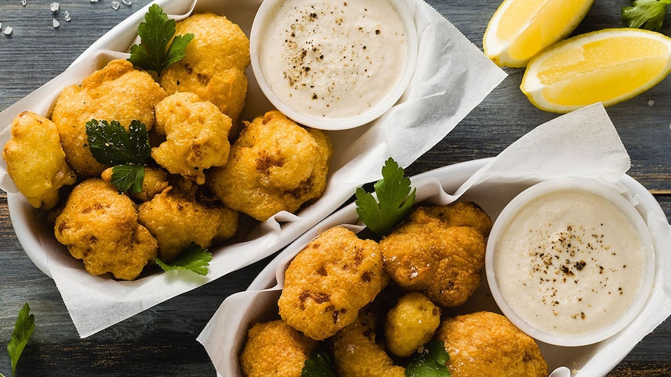 1. Bocaditos de coliflor especiada con salsa de cebollino