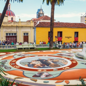 En la isla de Tenerife, la ciudad de La Orotava despliega todo su arte y tradición en una de las celebraciones más bellas del Corpus Christi. Sus calles adoquinadas y su aire colonial se visten de color con gigantescas alfombras hechas de flores, semillas y arena volcánica. Estos tapices cubren el asfalto para recibir la procesión del Santísimo Sacramento, en un recorrido que se transforma en una verdadera exposición al aire libre.