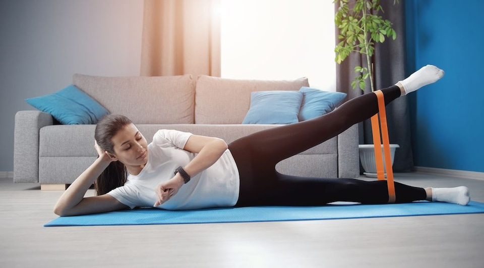 Túmbate de lado con la banda alrededor de los tobillos. Eleva la pierna superior lentamente contra la resistencia, cuidando de no girar el tronco. Desciende de manera controlada.