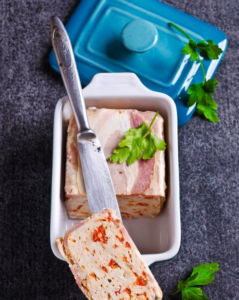 Colorida y fresca, esta terrina aprovecha los sabores de los pimientos rojo, verde y amarillo asados al horno, mezclados con una crema a base de queso cremoso, queso de cabra, nata, miel, limón y un toque de pimienta roja. La mezcla se monta por capas alternas de tiras de pimiento y crema de queso, y se enfría para que tome cuerpo. Al desmoldarla, revela un interior vibrante y sabroso. Ideal para acompañar con crackers o como parte de un brunch.