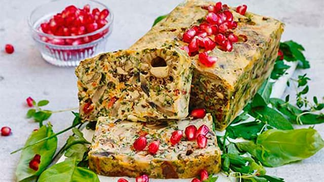 Una combinación muy sabrosa que une el sabor umami de los champiñones y los tomates secos con el frescor de las semillas de granada. La mezcla incorpora además cebolla salteada, queso rallado, leche, huevos y hierbas aromáticas. Se hornea al baño maría durante una hora y media, y tras enfriarla, se desmolda para decorarla con granos de granada. Es una opción muy versátil que funciona bien tanto en una mesa festiva como en un almuerzo informal.