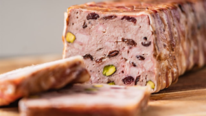 Una receta jugosa y llena de contrastes gracias al dulzor de las pasas y el toque crujiente de los pistachos. Se mezcla carne picada de pollo con nata, huevos, chalotas pochadas, un chorrito de brandy y los frutos secos. La mezcla se vierte en un molde forrado con lonchas de beicon y se cocina al baño maría en el horno durante unos 55 minutos. El resultado es una terrina sabrosa, ideal para servir fría con pan tostado o una ensalada.
