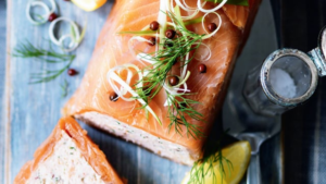 Una receta ideal para los amantes del pescado. Se emplea una rodaja de salmón cocido y desmenuzado, salmón ahumado, cebolleta, queso cremoso, nata, limón y eneldo. El conjunto se mezcla con gelatina previamente hidratada y se monta en un molde forrado con lonchas de salmón ahumado. Tras unas horas en la nevera con algo de peso encima, queda una terrina firme, delicada y aromática. Es excelente como entrante, acompañada de pan de centeno o blinis.