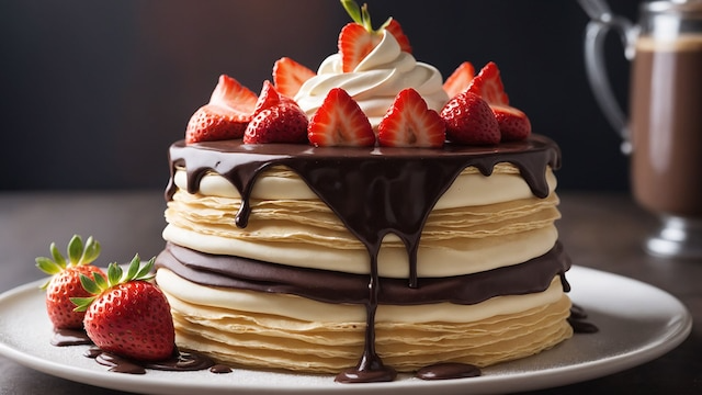 Preparación: Haz los crepes mezclando los ingredientes y cocinándolos en sartén. Para la crema, cocina los ingredientes, tritura y enfría. Alterna capas de crepe y crema. Cubre con chocolate fundido, nata montada y fresas. Una tarta original que no deja indiferente.