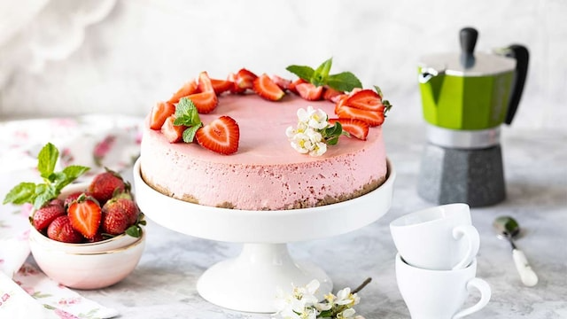 Preparación: Tritura las galletas y mézclalas con mantequilla derretida. Presiona la mezcla en el fondo de un molde desmontable y enfría. Hidrata la gelatina con parte de la leche. Tritura las fresas y cuélalas. Calienta el resto de la leche, añade la gelatina y mezcla con el puré. Monta la nata con el azúcar y combínala con el puré con movimientos envolventes. Vierte sobre la base de galleta y refrigera al menos dos horas. Decora con fresas, menta y flores.