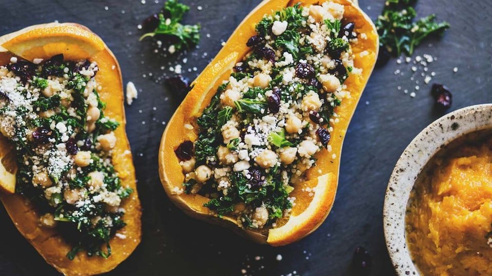 Un plato completo, ideal para una comida otoñal. El contraste entre la calabaza asada y el relleno especiado es irresistible.