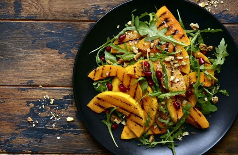 7. Ensalada templada de calabaza a la parrilla con granada y rúcula
