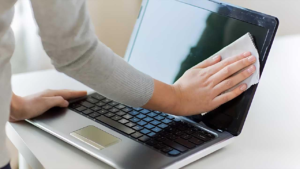 - Para teclados de portátiles: apaga la computadora y desconecta cualquier cable o adaptador. Voltea el equipo boca abajo y dale suaves golpes en la parte inferior para que caigan los restos de suciedad. Luego, usa aire comprimido para limpiar las teclas con ráfagas cortas, y, al igual que con el teclado externo, utiliza un paño de microfibra húmedo para finalizar la limpieza.