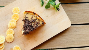 La banana aporta cremosidad y un dulzor natural que combina a la perfección con los quesos, dando como resultado una tarta suave y aromática.