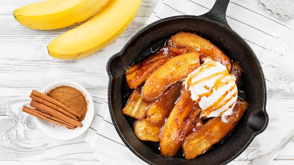 - Derrite la mantequilla en una sartén a fuego medio y coloca las bananas. Espolvorea con canela y cocina hasta que se doren ligeramente.