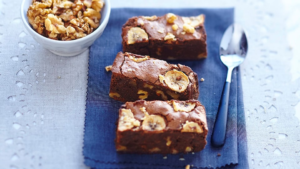 La banana aporta jugosidad extra al brownie y combina especialmente bien con el chocolate intenso y el toque crujiente de las nueces.