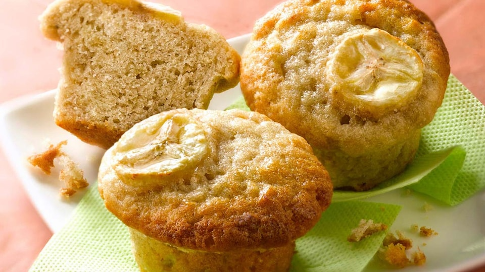 - Rellena moldes de muffin hasta tres cuartas partes de su capacidad y coloca una rodaja de banana encima.