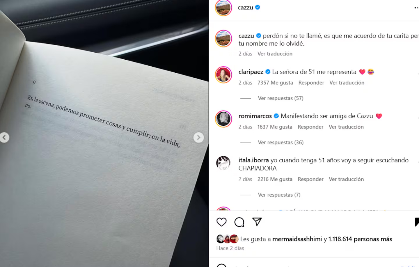 Además, compartió una imagen con una cita literaria que decía: “En la escena podemos prometer y cumplir; en la vida, no”, lo que fue interpretado por sus seguidores como una posible alusión a su expareja y a las promesas incumplidas tras la ruptura.