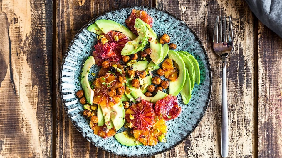 Ensalada de aguacates con naranja, pistachos y garbanzos crujientes