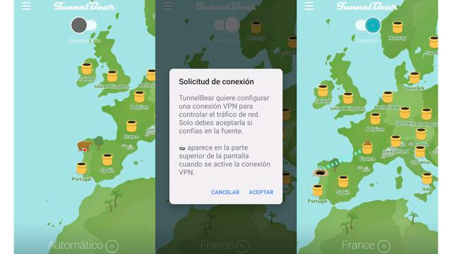 Para dispositivos Android, una de las opciones más sencillas es usar aplicaciones especializadas como TunnelBear: