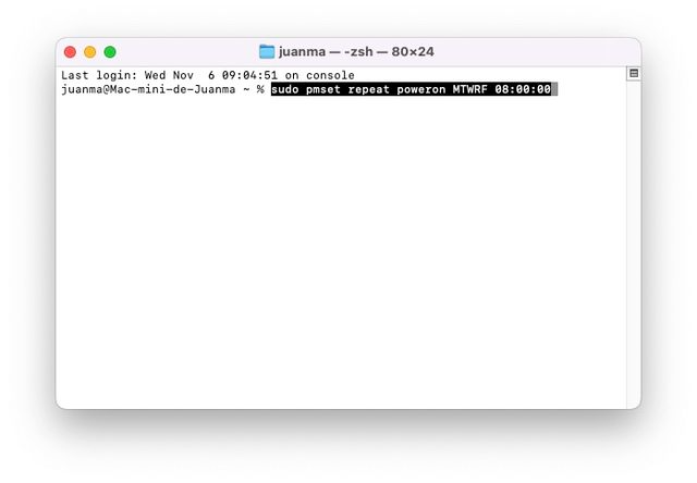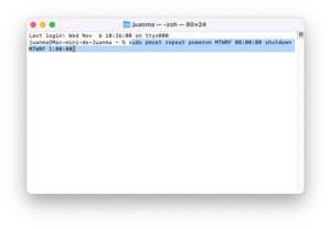 Para programar el encendido, utiliza el siguiente comando en Terminal: