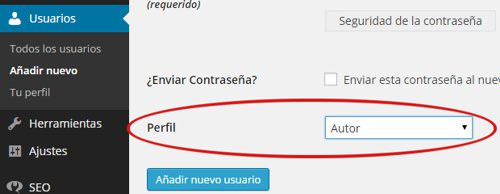 4. También se encontrarán con un apartado que dice perfil. Allí es donde seleccionarán por decirlo de alguna manera, el grado de poder que el nuevo usuario tendrá del blog. Siendo el “Administrador” el de mayor jerarquía y el “Suscriptor” (sólo puede leer contenido privado del blog) el de menor jerarquía. En el medio tendrán la opción de elegir “Editor”, el cual opera casi como un administrador salvo por algunas funciones como instalar plugins, modificar plantillas, etc. Por otro lado, tenemos al “Autor” y al “Colaborador”. Lo que hacen ambos es lo mismo, publicar artículos y noticias; con la diferencia que el primero no necesita un permiso del administrador para publicar mientras que el segundo sí.