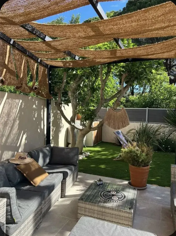 Si lo tuyo es el estilo rústico o bohemio, los toldos hechos con fibras naturales como yute o mimbre son una excelente alternativa. No solo se ven bien, sino que permiten que circule el aire y aportan una protección discreta contra el sol y las miradas ajenas.