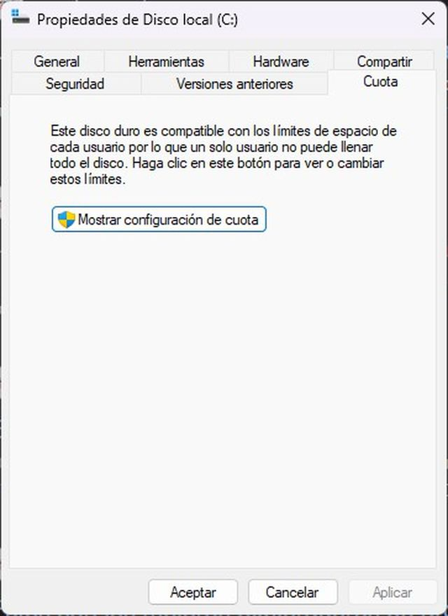 - Accede nuevamente a la pestaña Cuota en las propiedades del disco.