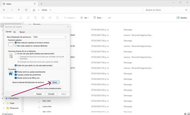 Con esta acción se eliminarán todos los accesos recientes almacenados, tanto de archivos como de carpetas. Es una opción rápida para limpiar el sistema sin tener que desactivar funciones permanentemente.