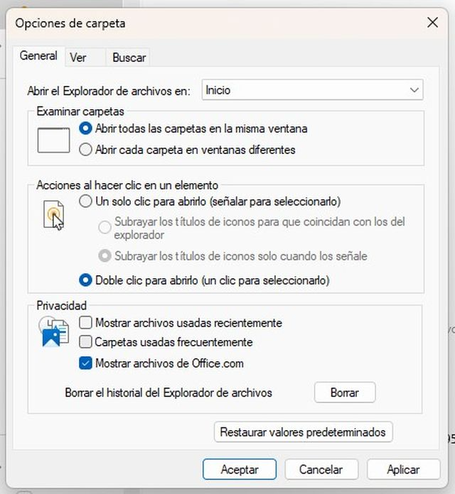 Si prefieres que el Explorador de archivos deje de mostrar elementos recientes por completo, puedes desactivar esta función desde la configuración del sistema. Esto evitará que se generen nuevos registros de actividad y también ocultará las carpetas usadas con frecuencia.