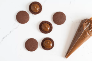 10- Cuando las galletas estén frías, colocamos 350 gramos de dulce de leche en una manga pastelera. Ponemos una pequeña porción de relleno sobre la mitad de las galletas.