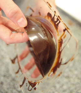- Con un pincel o vertiendo directamente, cubrí el interior de los moldes con una capa de chocolate.
