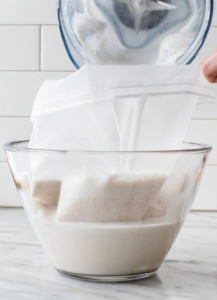 Después de licuar, tendrás una mezcla espesa y algo granulada. Para obtener una leche suave y sin residuos, es necesario colarla. Lo ideal es usar una bolsa para leches vegetales (se consigue fácilmente en tiendas naturistas o de cocina), aunque también puedes usar una gasa limpia o un paño de algodón fino.