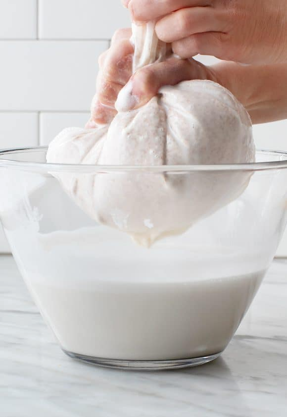 Coloca la bolsa sobre un bol grande y vierte la mezcla dentro. Luego, cierra la parte superior y exprime suavemente con las manos para extraer todo el líquido. Lo que queda dentro de la bolsa es la pulpa de almendra, que puedes guardar para otras preparaciones.