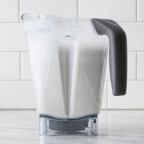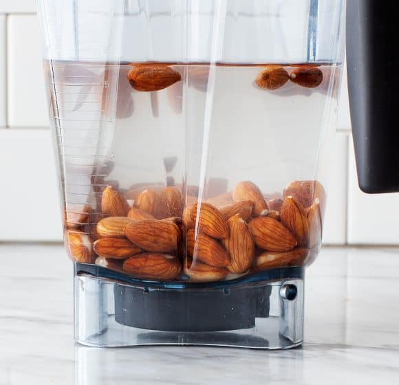 Coloca las almendras hidratadas en una licuadora junto con las 3½ tazas de agua filtrada. Licúa a máxima potencia durante unos 30 segundos a 1 minuto, o hasta que la mezcla se vea blanca y espumosa. Si tu licuadora es muy potente, el resultado será más homogéneo y cremoso.