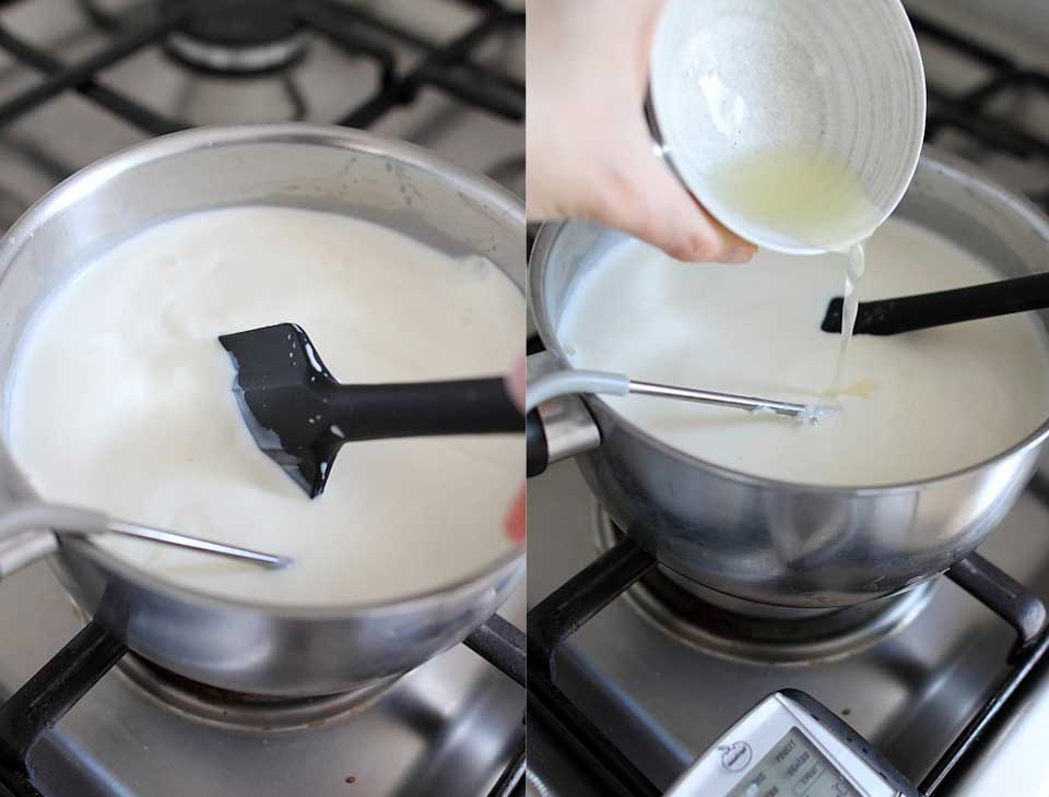 - Añadir el ácido y el yogur. Una vez caliente, incorpora el zumo de limón y el yogur natural. Remueve con suavidad y notarás que la leche comienza a cortarse, separándose el suero de la cuajada.