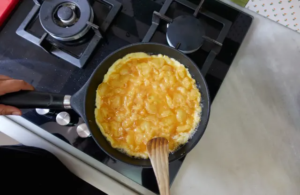 Antes de que termine de cocinarse todo, agarramos un bol y batimos los 6 huevos. Agregamos sal y demás condimentos. Cuando las papas y lo demás está todo listo, lo sacamos del fuego y lo colocamos en el bol. Luego mezclamos suavemente con los huevos. agarramos otra sartén o limpiamos la misma y colocamos la mezcla. Ahora solo hay que esperar que se cocine de un lado, a fuego mínimo, aproximadamente 10 minutos. Lo difícil viene ahora, es decir, una vez pasados los 10 minutos, hay que dar vuelta la tortilla. Para esto les recomiendo que agarren una tapa plana y la coloquen arriba de la sartén, después la levantan ( la sartén) y giran rápidamente hasta que la tortilla caiga arriba de la tapa y deslizan ésta nuevamente en la sartén.
