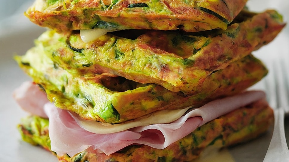 Wafles de zanahoria y calabacín rellenos de jamón y queso
