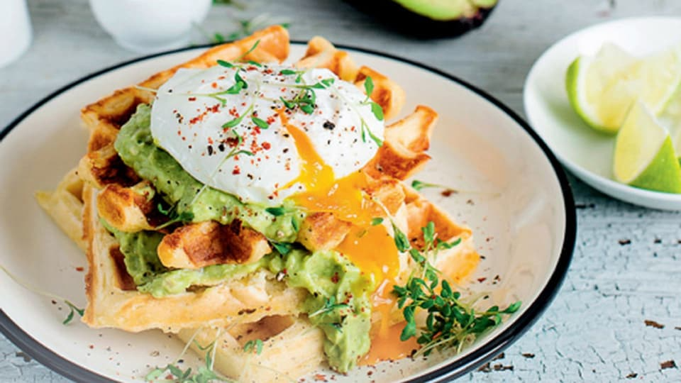 Prepara huevos poché cociéndolos en agua con un chorrito de vinagre hasta que la clara esté cuajada pero la yema líquida. Unta los wafles con una capa generosa de guacamole, coloca encima los huevos poché, espolvorea con sal y pimienta negra y roja, y decora con brotes frescos. Un plato sencillo pero lleno de sabor.