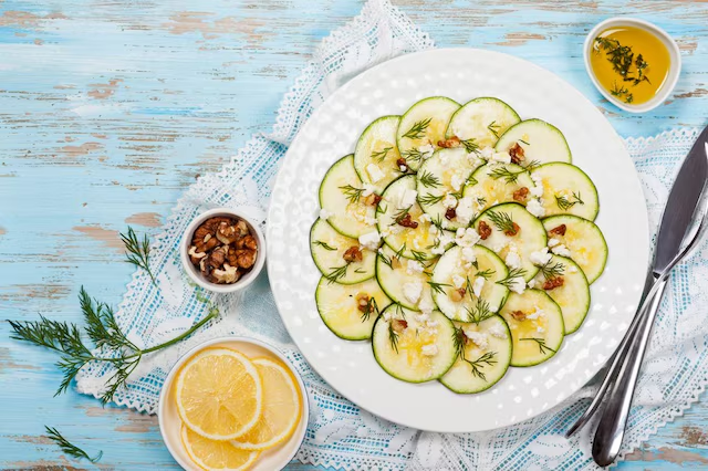 Otra forma atractiva de incorporar el calabacín crudo es en carpaccios. En este caso, se corta en láminas muy finas, idealmente con una mandolina, y se utiliza como base para distintas combinaciones de sabores.