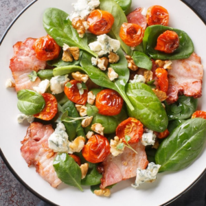 4. Mezcla en una ensaladera las espinacas, los tomates, las nueces, la panceta y el queso Roquefort desmenuzado.