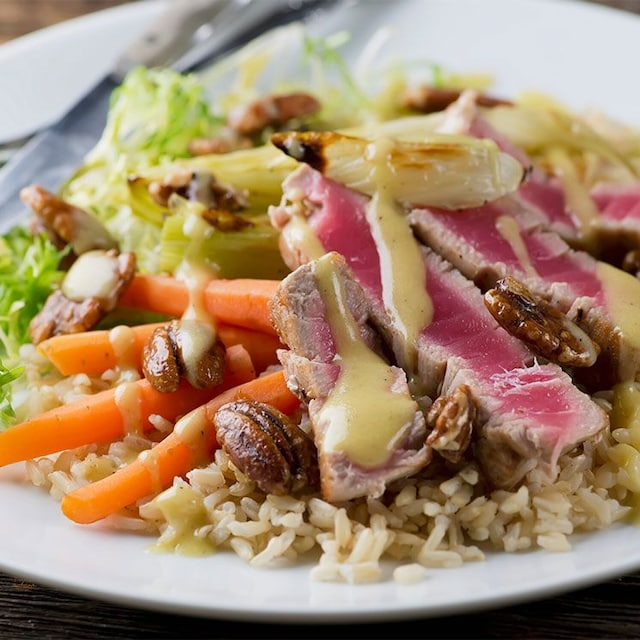 6. Sirve una base de arroz en cada plato, coloca los medallones de atún, las zanahorias, las cebollitas, la escarola y las nueces pecanas.